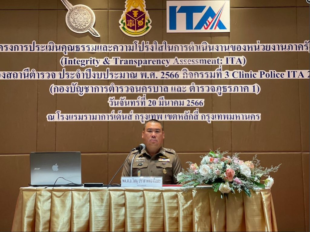 วันที่ 20 มีนาคม 2566 สำนักงาน ป.ป.ช. โดยสำนักประเมินคุณธรรมและความโปร่งใส จัดกิจกรรม Clinic Police ITA 2023 (กองบัญชาการตำรวจนครบาล และตำรวจภูธรภาค 1) โดยมี พล.ต.อ.วิสนุ ปราสาททองโอสถ จเรตำรวจแห่งชาติ เป็นประธานในพิธีเปิดกิจกรรมฯ และ นายทวิชาติ นิลกาญจน์ ผู้ช่วยเลขาธิการคณะกรรมการ ป.ป.ช. เป็นผู้กล่าวรายงาน ณ โรงแรมรามาการ์เด็นส์ กรุงเทพ เขตหลักสี่ กรุงเทพมหานคร