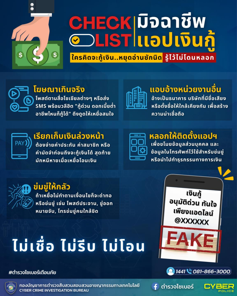 ประชาสัมพันธ์ CHECK LIST มิจฉาชีพ แอปเงินกู้ “ใครคิดจะกู้เงิน…หยุดอ่านซักนิด/รู้ไว้ไม่โดนหลอก “ไม่เชื่อ ไม่รีบ ไม่โอน” แจ้งเหตุโทร 056-946-403 หรือ 191