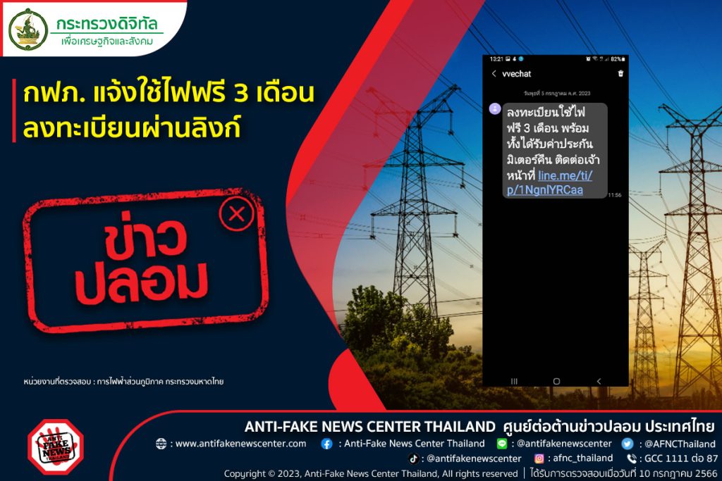 ประชาสัมพันธ์ เตือน”ข่าวปลอม” กฟภ.แจ้งใช้ไฟฟรี 3 เดือน ลงทะเบียนผ่านลิงก์ ANTI-FAKE NEWS