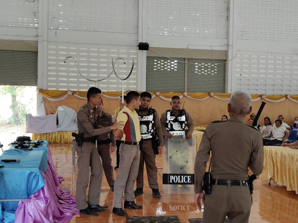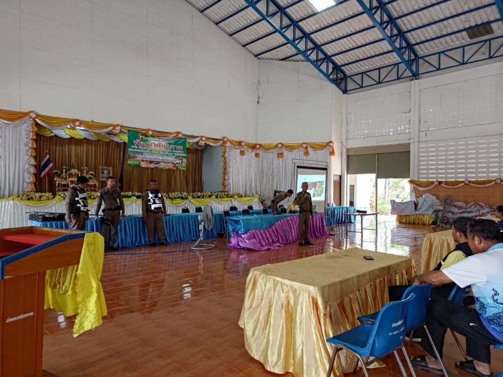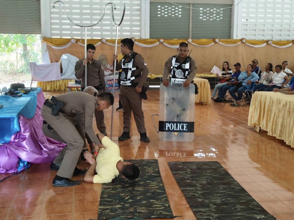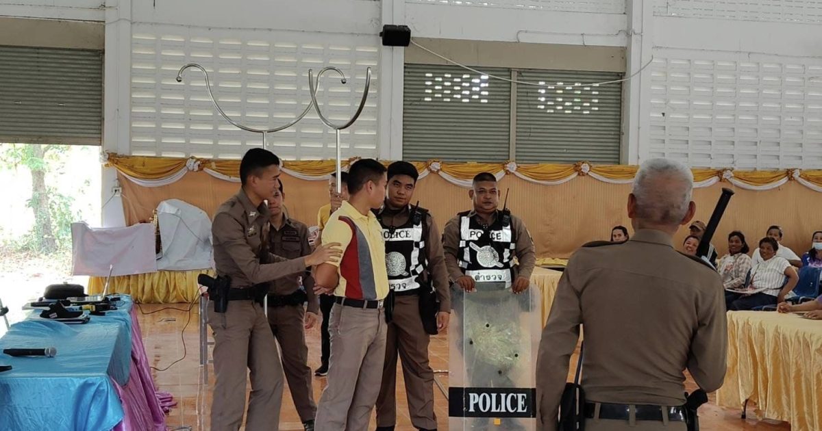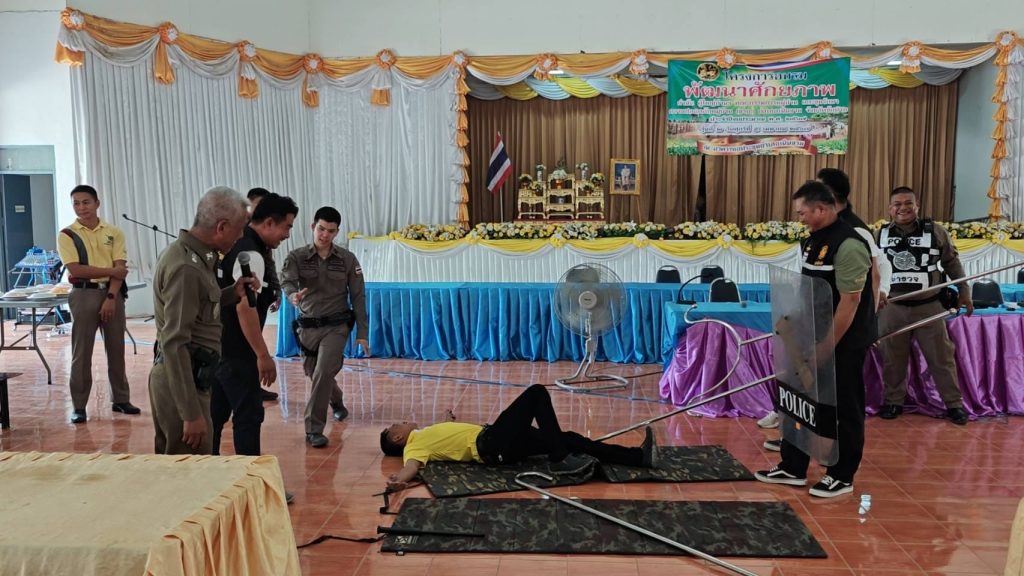 พ.ต.ต.ประสิทธิ์ ศิริธรรม สวป. สภ.เนินขาม นำข้าราชการตำรวจชุด ชมส. และสายตรวจรถยนต์ 20 บรรยายให้ความรู้ อำนาจจับกุม ตรวจค้น การใช้ยุทธวิธีไม้ง่าม กับกำนันผู้ใหญ่บ้านและ ชรบ. เนื่องในโครงการพัฒนาศักยภาพกำนันผู้ใหญ่บ้าน ณ หอประชุมอำเภอเนินขาม (5 เม.ย.67)