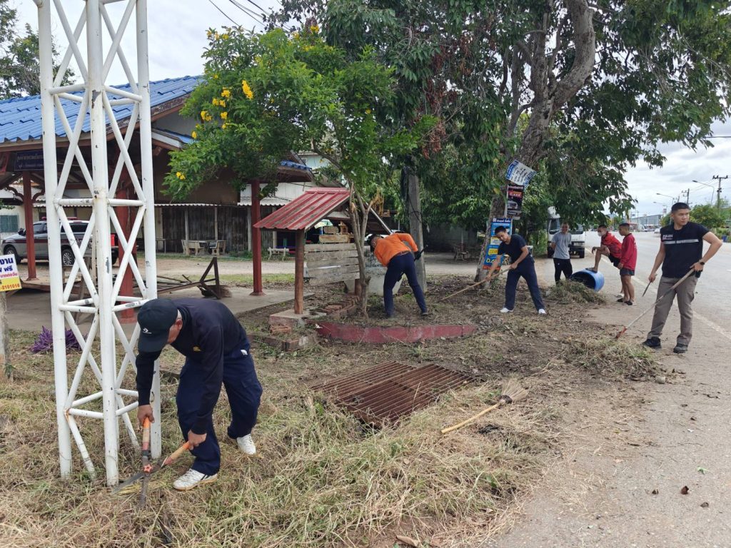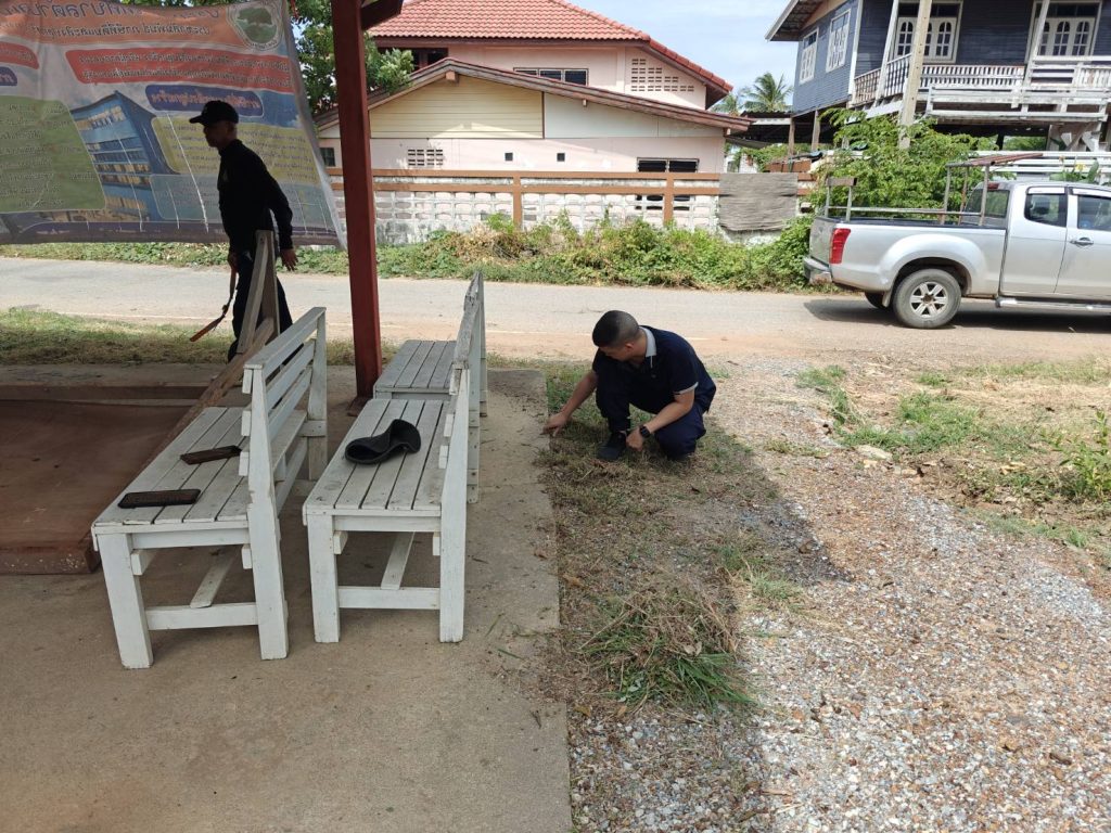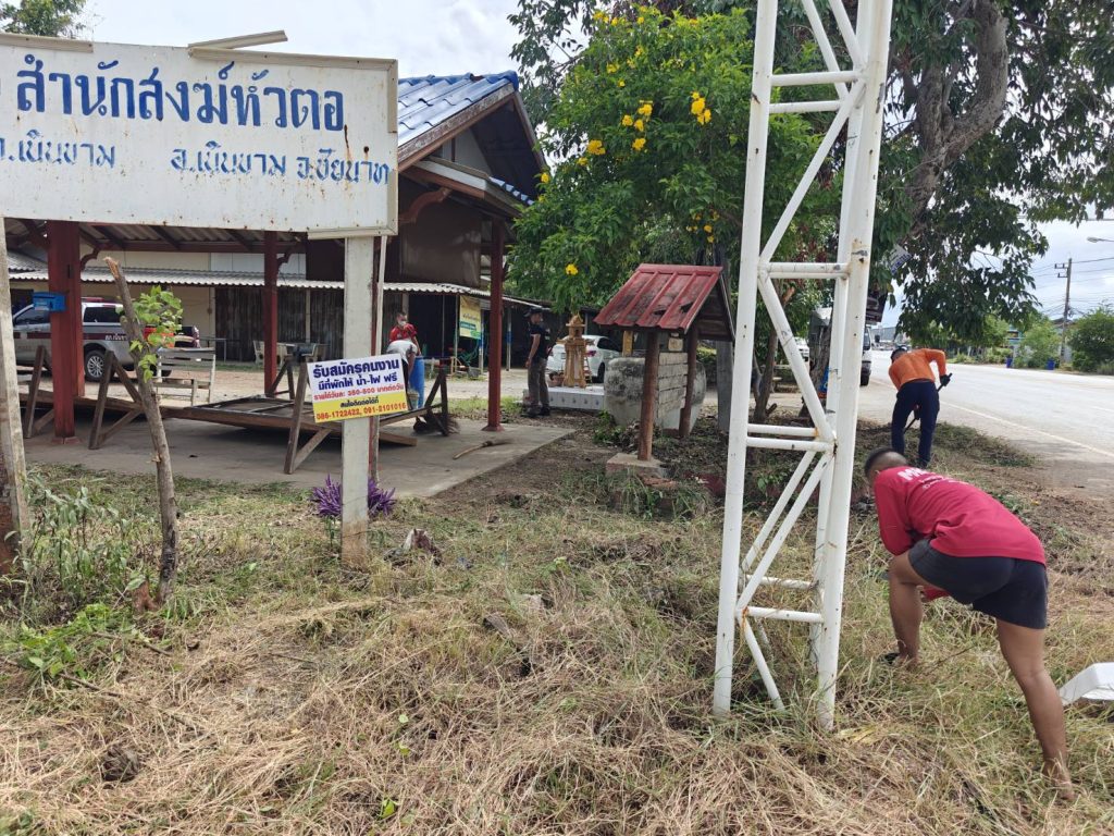 พ.ต.ต.ประสิทธิ์ ศิริธรรม สวป. สภ.เนินขาม พร้อมชุดมวลชนสัมพันธ์ สภ.เนินขาม ร่วมทำความสะอาดทำความสะอาดศูนย์ปฏิบัติการชุมชนบำบัดเพื่อเปิดโครงการในวันที่ 12 มิ.ย. 67