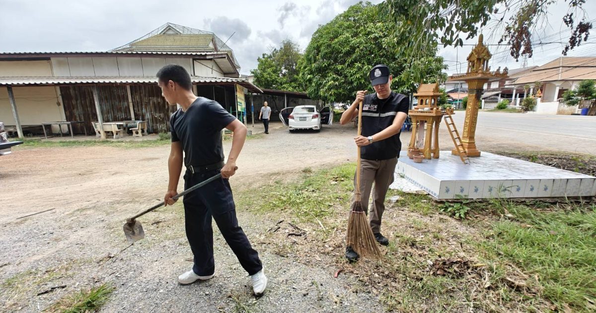 พ.ต.ต.ประสิทธิ์ ศิริธรรม สวป. สภ.เนินขาม พร้อมชุดมวลชนสัมพันธ์ สภ.เนินขาม ร่วมทำความสะอาดทำความสะอาดศูนย์ปฏิบัติการชุมชนบำบัดเพื่อเปิดโครงการในวันที่ 12 มิ.ย. 67