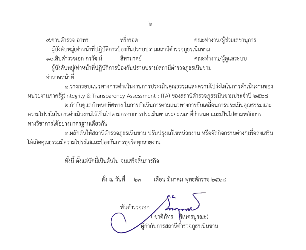 - วันที่ 11 ธันวาคม พ.ศ. 2567- พ.ต.อ.ชาติภัทร พิเนตรบูรณะ ผกก.สภ.เนินขาม ประชุมบริหารประจำเดือนและขับเคลื่อนการประเมินคุณธรรมเเละความโปร่งใสในการดำเนินงานของหน่วยงานภาครัฐ (ITA) ประจำปีงบประมาณ พ.ศ.2568 และประกาศการต่อต้านการทุจริตเเละการรับสินบน (Anti – Bribery Policy)