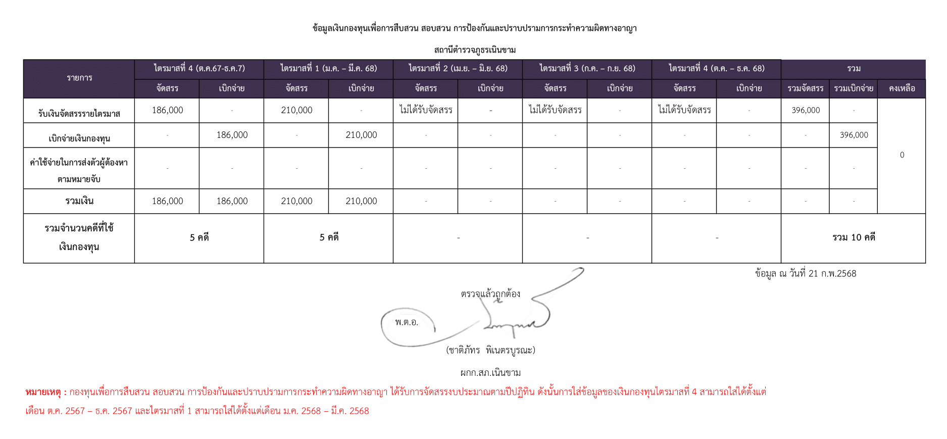 O13 – ข้อมูลเงินกองทุนเพื่อการสืบสวนสอบสวนการป้องกันและปราบปรามการกระทำผิดในคดีอาญา