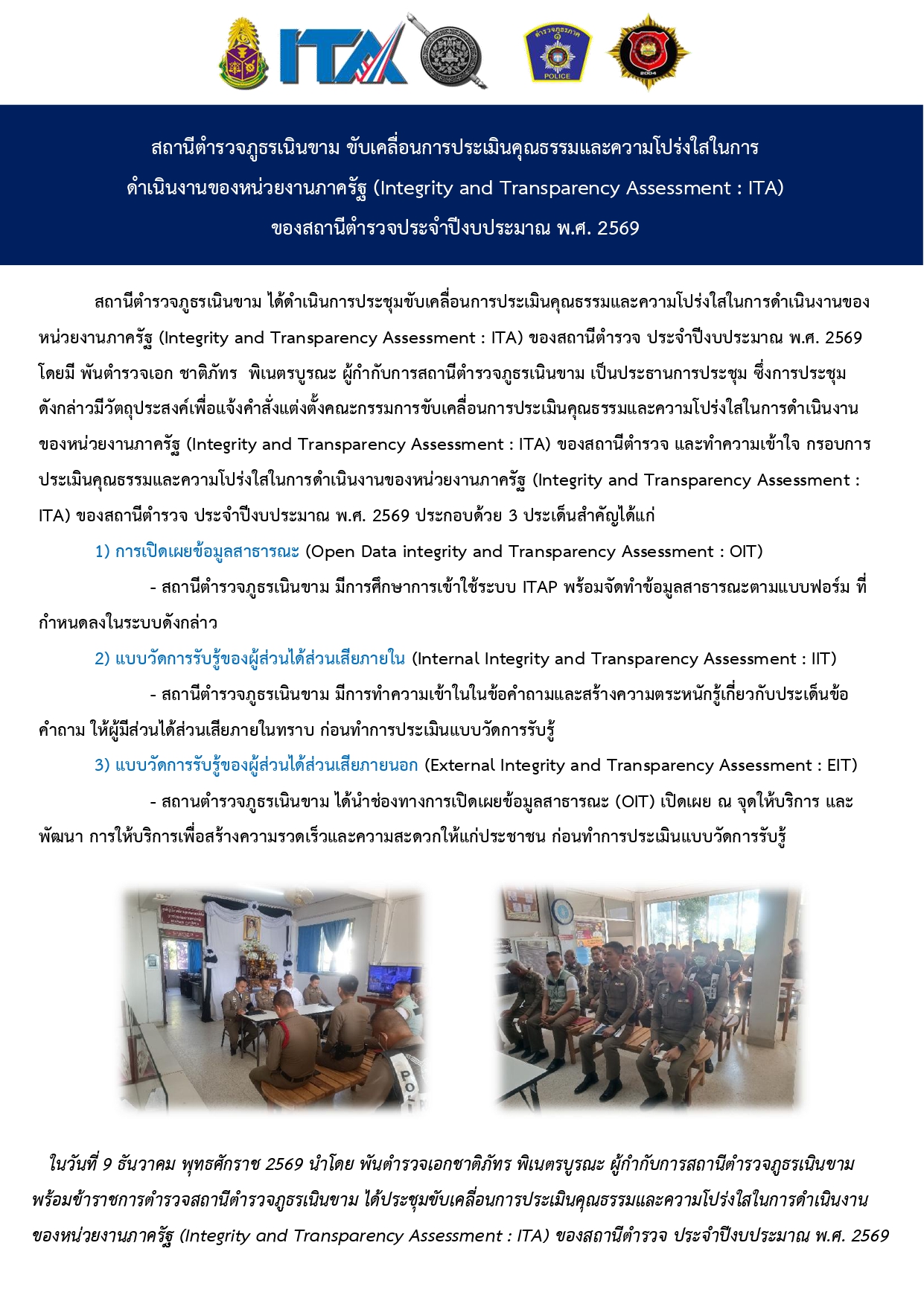 สภ.เนินขาม ฯ ประชุมบริหารประจำเดือนและขับเคลื่อนการประเมินคุณธรรมเเละความโปร่งใสในการดำเนินงานของหน่วยงานภาครัฐ (ITA) ประจำปีงบประมาณ พ.ศ.2568 เน้นย้ำการต่อต้านการทุจริตเเละการรับสินบน (Anti – Bribery Policy) ( 6 ก.พ.68 )